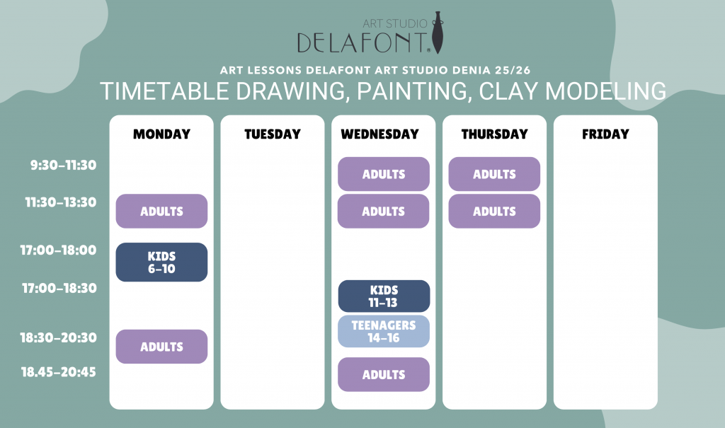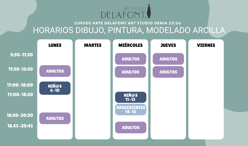 • Edades de 11-16 años: Miércoles de 17h-18:30h. Dibujo, Pintura, Acuarela, Estampación, Modelado y Cerámica.
