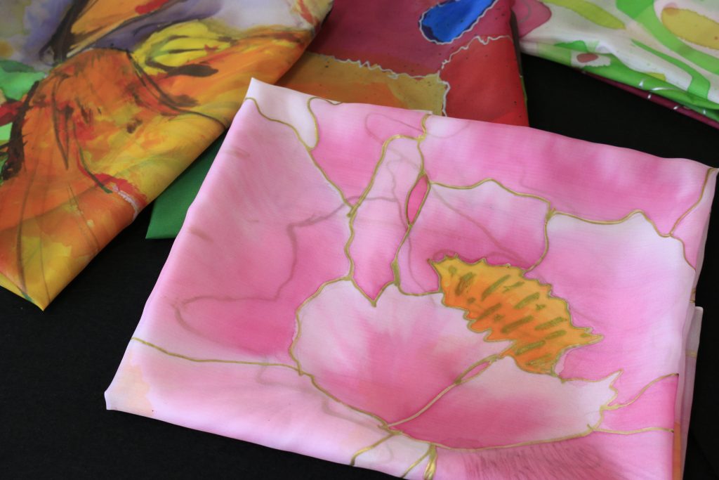 And you will also get your handkerchief painted and ready to use or give as a gift. What materials do we use? We will use natural silk scarves, brushes, frames, and special paint for silk. Materials included.